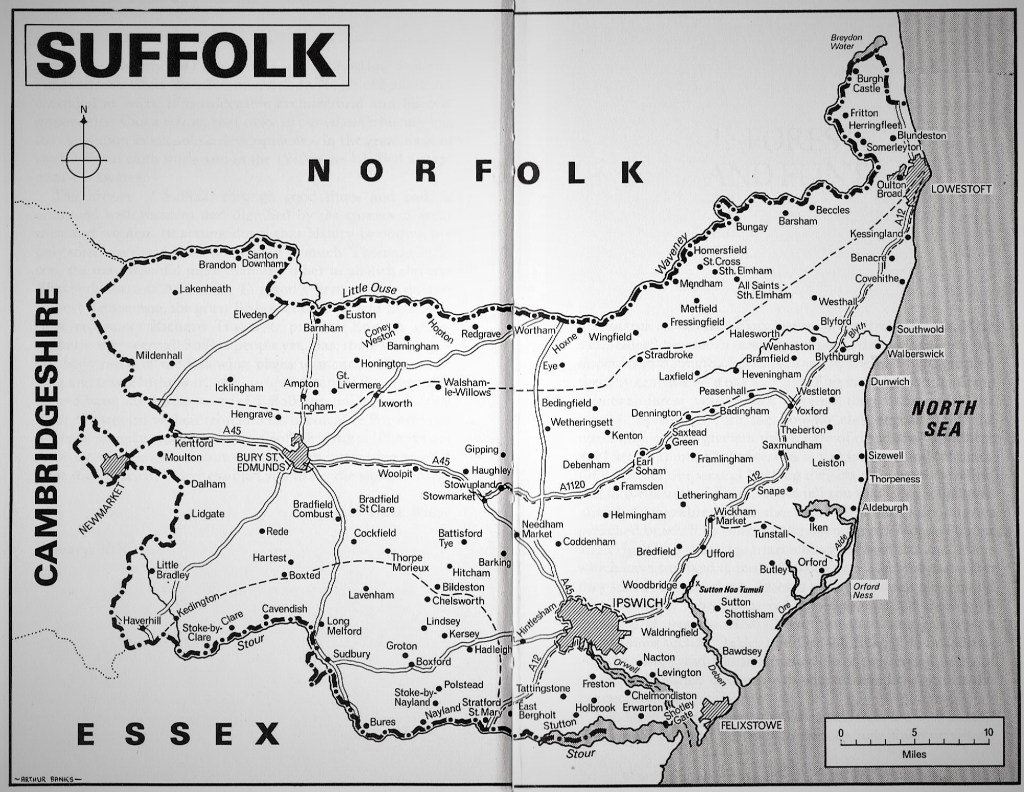 A Modern Map of Suffolk, showing the rivers, routes, towns & villages.