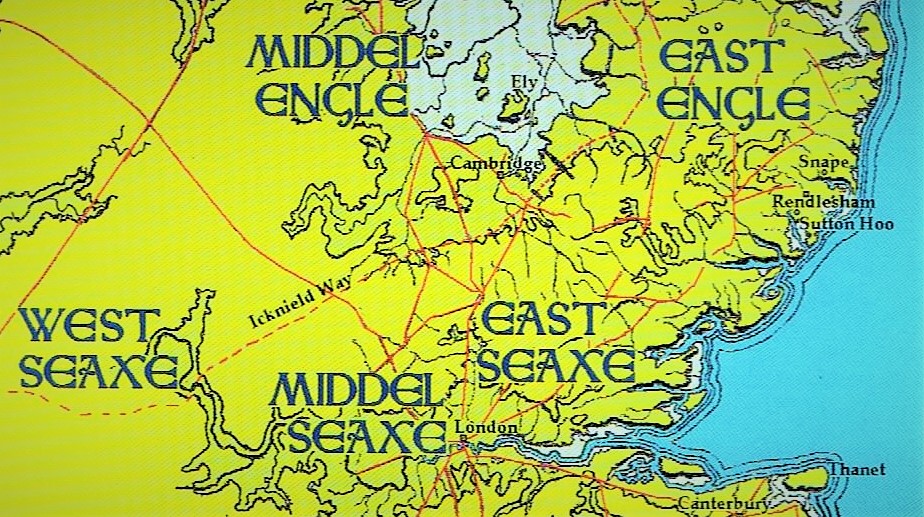 The maps on the right show how the Angles, Saxons and Jutes formed themselves into seven kingdoms, but they were sketched and published just after the second world war before the finds at Sutton Hoo were well known outside archaeological circles. Moreover, the frontiers shown are those of the early ninth century, as the inclusion of Offa’s Dyke reveals. The smaller kingdoms, such as East Anglia, were truly independent only for short periods, but one of these was the period of the reign of Raedwald, who became Bretwalda in 617, as confirmed by the twelfth-century Anglo-Norman poet Geffrei Gaimar, probably drawing on a lost version of the Anglo-Saxon Chronicle. Bede’s later chapter on the coming of Christianity to the East Anglian kingdom tells us of how circa 626-27, King Edwin of the Northern Angles (ruled c. 617-633) persuaded King Eorpwald of the Eastern Angles, Raedwald’s second son and eventual successor, to accept baptism. This would have meant that Raedwald was Bretwalda until, nearing death in 624-5, he handed the title to his friend and ally, Edwin. Recently, teams of archaeologists have been exploring a possible site at Rendlesham in Suffolk, located on the east bank of the River Deben some four miles upstream from Sutton Hoo.