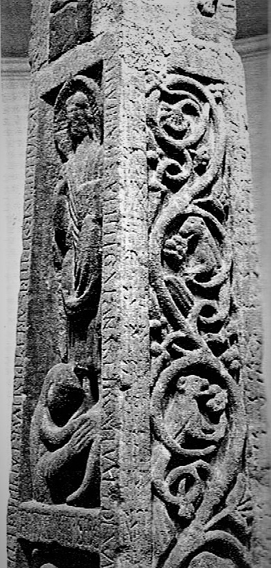 The Ruthwell Cross, Dumfries & Galloway. A detail of the shaft of the Cross (c.670-750), showing (left) Christ with Mary Magdalene anointing his feet and (right) beasts in swirling ornamentation. The cross is carved with Latin and runic inscriptions.