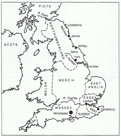 The seven Anglo-Saxon kingdoms in the late eighth century.