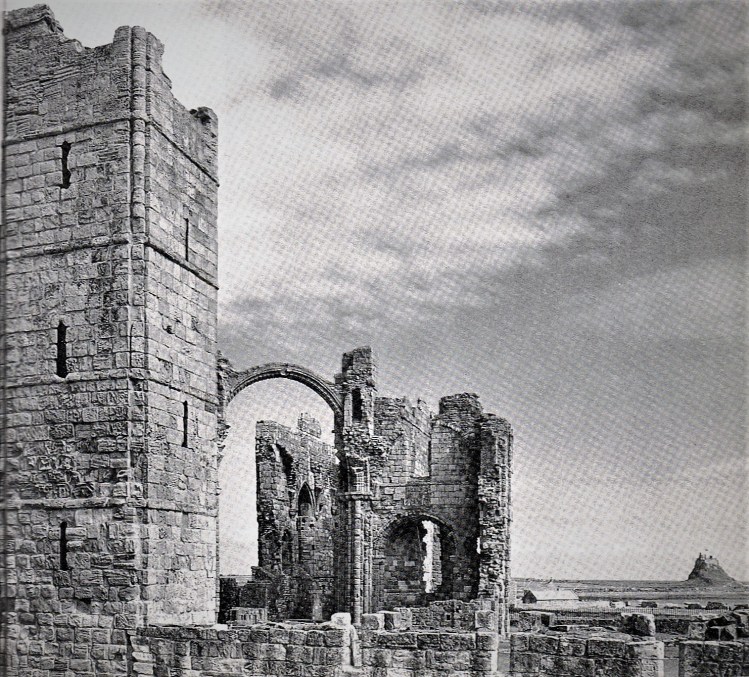 Lindisfarne, Northumberland. Ruins of the medieval monastery refounded on the site of St Aidan’s monastery. Lindisfarne Castle, restored by Sir Edwin Lutyens, is on the right of the picture in the distance. The island was where Cuthbert retired to and died.