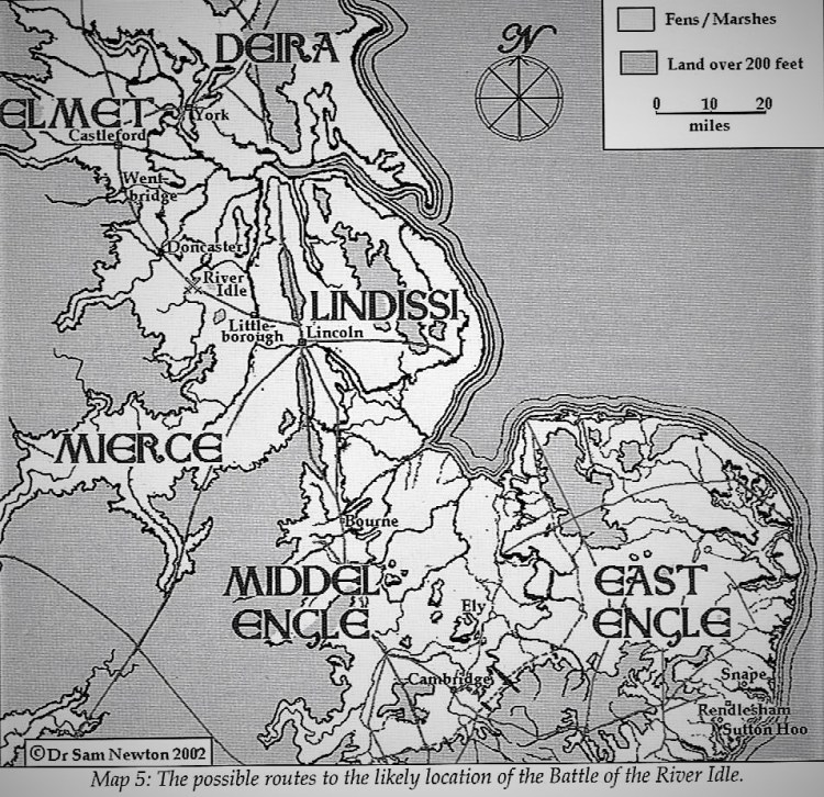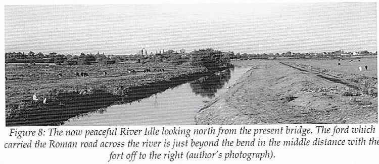 Bede’s account of the war between Raedwald and Aethelfrith is brief, and not without some Northumbrian bias. He states that Raedwald assembled a great army and marched north to meet Aethelfrith before the latter had time to summon his whole strength. It seems unlikely that the battle-hardened Northumbrian king would have launched an invasion force against East Anglia without sufficient forces to carry through his threat, but Aethelfrith’s forces were probably depleted after his recent campaign against the Britons both before and after the Battle of Chester. He may have, at the same time, have over-extended his military resources and become over-confident by his victories across the north. Bede tells us that the great battle between the Northumbrians and East Anglians took place on the Mercian border on the east bank of the River Idle. The River Idle, seemingly named for its meandering through a broad flood plain, was a tributary of the Trent, formed part of Mercia’s border in Bede’s time, but it is not clear that that was the case in 616-17. Yet the Idle appears to have formed a section of the border between two administrative areas during the Roman period, especially at the point where it is crossed by the main Roman road to the north. This road also crosses the great natural boundary of river and marsh formed by the Humber estuary and its various tributaries. It runs in a north-westerly direction from a point on Ermine Street just north of Lincoln, crossing the Trent at Littleborough, the Idle near Bawtry, the Don at Doncaster, the Went at Wentbridge, the Aire at Castleford, from where it runs north to Tadcaster. The road was of great strategic significance for the peoples both north and south of the Humber.