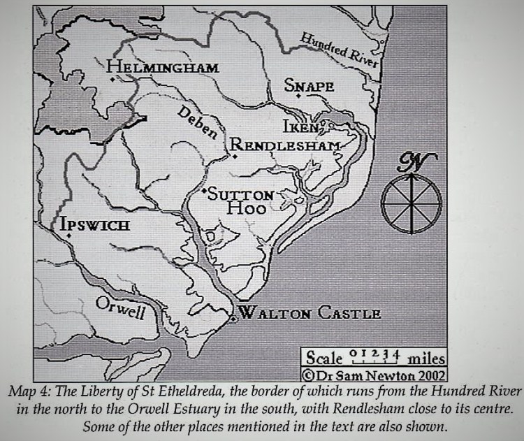 This whole area, centred on Rendlesham, Sutton Hoo and the Deben valley represent the old heartland of the Wuffing kingdom. Peter Warner describes this territory as both the cradle and resting-place of the early East Anglian kingdom. It was eventually bestowed as a Liberty by King Edgar (959-975), thus confirming the re-establishment of St Aetheldreda’s Abbey of Ely. In the year that Raedwald’s nephew, King Anna died in the Mercian massacre under the powerful pagan King Penda (654), Botolph built a monastery on the Alde estuary at Iken. Etheldreda or Aethelthryth (to give her name its proper spelling) was a Wuffing princess, being the saintly daughter of King Anna, and she fell under the spell of holy Felix and his monks. Her only ambition was to lead a life of contemplation and prayer, but as a princess, she was twice married off, apparently surviving both these ‘unions’ with her virginity intact. After twelve years of marriage to her second husband, Prince Egfrid of Northumbria, he gave her freedom to go and live as a nun, and she founded an Abbey on the Isle of Ely, doubling as a monastery for monks as well as nuns. As founding Abbess of Ely, she was enshrined as a saint after her death on 23 June 679. Following Edgar’s gift of the Five Hundreds of Wicklow, as the area came to be known, it remained a coherent territory until the late nineteenth century. All of this evidence adds weight to the argument that Raedwald’s temple of the two altars was within this territory and may have stood close to the royal hall site of the Wuffing kings at Rendlesham.