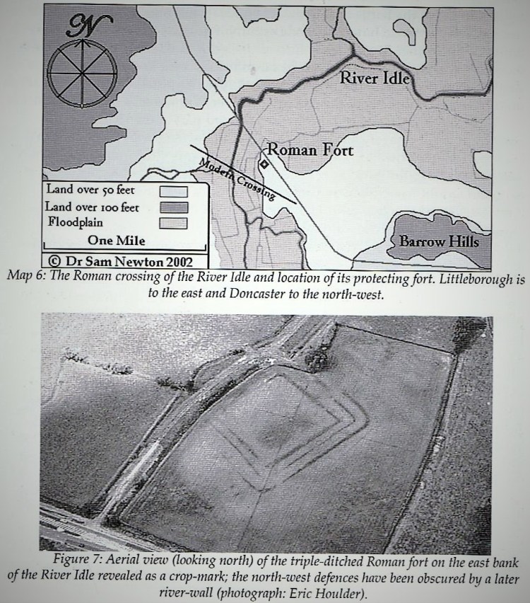 The suggestion is then that it was along this strategic road into the north that Raedwald advanced with his army to confront Aethelfrith. If this was the case, it becomes easier to trace his route on the ground, in the following series of maps. That Raedwald could organise and lead a long-distance military expedition on this scale implies that he was an experienced commander. His initial advance out of East Anglia could have followed two possible routes. He could have led his army overland along the Roman road from Cambridge along the southern edge of the great Fenland barrier until he came to Ermine Street, and thence along King Street via Bourne and Sleaford to Lincoln. Alternatively, he could have advanced more rapidly if he used a fleet using the former Roman army ferry crossing from Norfolk to Lincolnshire, approaching Lincoln from the east. The old Roman city of Lincoln then formed part of the kingdom of Lindsey, but it is not clear whether Raedwald’s overlordship extended over ‘Lindissi’. By whichever means he arrived at Lincoln, from the city Raedwald would have marched north along Ermine Street and then turned north-west towards Littleborough, a stronghold some eight miles down the road at the paved ford over the Trent. The river Idle crossing was twelve miles up the road from Littleborough and it was there that the battle with Aethelfrith is likely to have taken place. From the fourth century, this crossing had was controlled from its east bank by a Roman fort enclosing an area of about half an acre and protected by triple ditches, still visible from the air today.