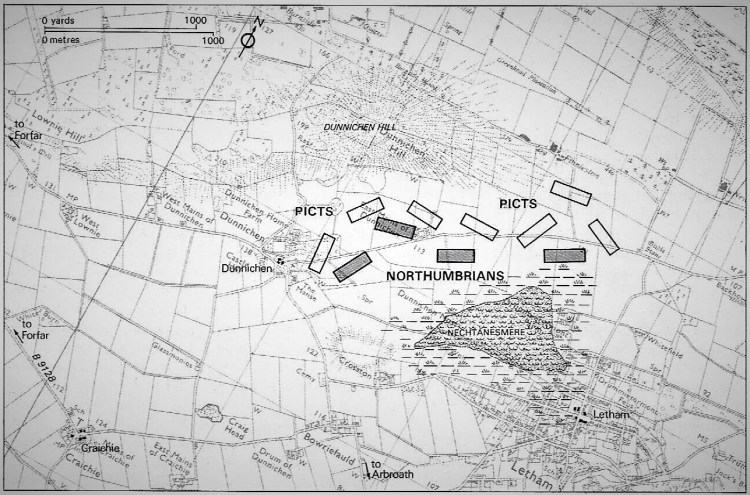 The reunification of the Church prepared the way for the Anglo-Saxons to be united under one king. Before Oswiu died in 670 he had driven the Picts back to the Tay, extracted tribute from the Cumbrians and the Welsh, and established a strong though decentralised grip on his Saxon sub-kingdoms. He was an early exponent of the ‘scorched earth’ policy in keeping the lands between Northumbria and ‘Scotland’ so barren that not even a Pictish army could find sustenance on them. It was only with Oswiu’s death in 670 that Mercian power began to reassert itself under the leadership of Penda’s son Wulfhere. In 674 Wulfhere invaded Northumbria and with an army drawn from all of the southern kingdoms, but he was repulsed by Oswiu’s son Ecgfrith, who proved himself equally able. He captured Cumberland and Westmorland from the Britons and even invaded Ireland. But in 678 Ecgfrith was defeated in turn by Wulfhere’s brother Aethelred at the battle of Trent, in what proved to be the last clash between the armies of Mercia and Northumbria for a generation. It was also the final attempt by Northumbria to gain control of the southern kingdoms and henceforth the Northumbrian kingdom’s concern would rest primarily with the north. In 685 Ecgfrith led an army northwards against the Picts, despite the protests of his advisers, for his expedition was considered by them as unnecessary aggression. The Picts, led by their king Brude Mac Beli, retreated before Ecgfrith’s advance, drawing him into the difficult territory of the Sidlaw Hills. They turned upon the pursuers and defeated them in battle near a loch called Nechtanesmere, by Dunnichen Hill, south-east of Forfar, shown on the map below. Dark Age battle sites, as noted above, are notoriously difficult to place in specific locations. The Battle known as that of ‘Dunnichen Moss’ or Nechtanesmere was fought on the banks of a loch, or ‘mere’ which has since disappeared. Its location has been pinpointed to an area between Dunnichen and Letham, south of the modern road between Forfar and Arbroath.