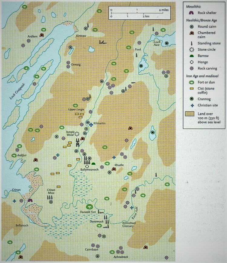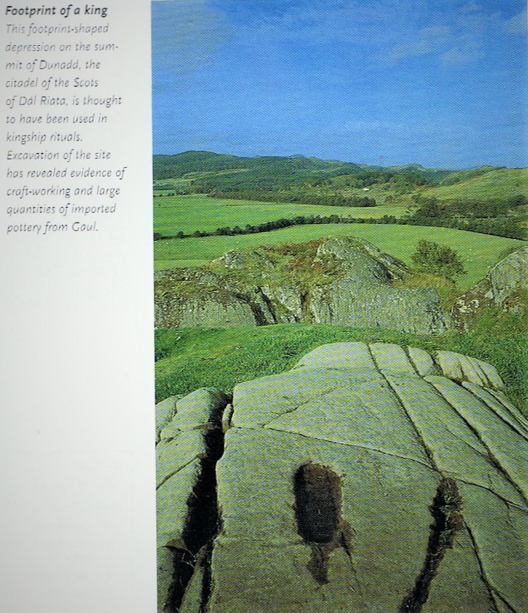 Traditionally, the extension of the kingdom of Dál Riata was not so much a recent Irish colony as the eastern part of a Gaelic-speaking zone that straddled the North Channel. The physical proximity and maritime culture encouraged deep connections between western Scotland and Ireland, which persisted throughout the Middle Ages. The characteristic form of royal settlement in Celtic-speaking Britain was the hill-fort. Although sometimes built on the sites of Iron Age hill-forts, the early medieval hill-fort was a new phenomenon. It tended to occupy a craggy knoll, rather than towering heights, and the elaborate masonry or earthwork ramparts were enclosed relatively small areas suitable for the residence of the king and his extended household. Although they are architecturally quite different from the later medieval castles, these fortified dwellings served a similar range of domestic, administrative and ceremonial functions. Where these have been excavated (for example, at Tintagel and Dunadd in Argyll) they have produced similar kinds of evidence for the manufacturing of fine metalwork and the importation of pottery, glassware and wine from the continent via the Irish Sea. These finds attest to regular trade with Gaul. Early medieval kings were keen to legitimise their power by associating themselves with sites of ancient authority. This is most obviously apparent from Dunadd, the chief royal fortress of Dál Riata, which, as shown on the map below, occupies a rocky knoll overlooking the richest prehistoric ritual landscape in western Scotland. Since Neolithic times people have been coming to the Kilmartin valley in Argyll to bury their dead, erecting standing stones and creating rock art on outcrops. These ancient associations cannot have been lost on the founders of Dunadd and were arguably a primary motive for the site’s selection.