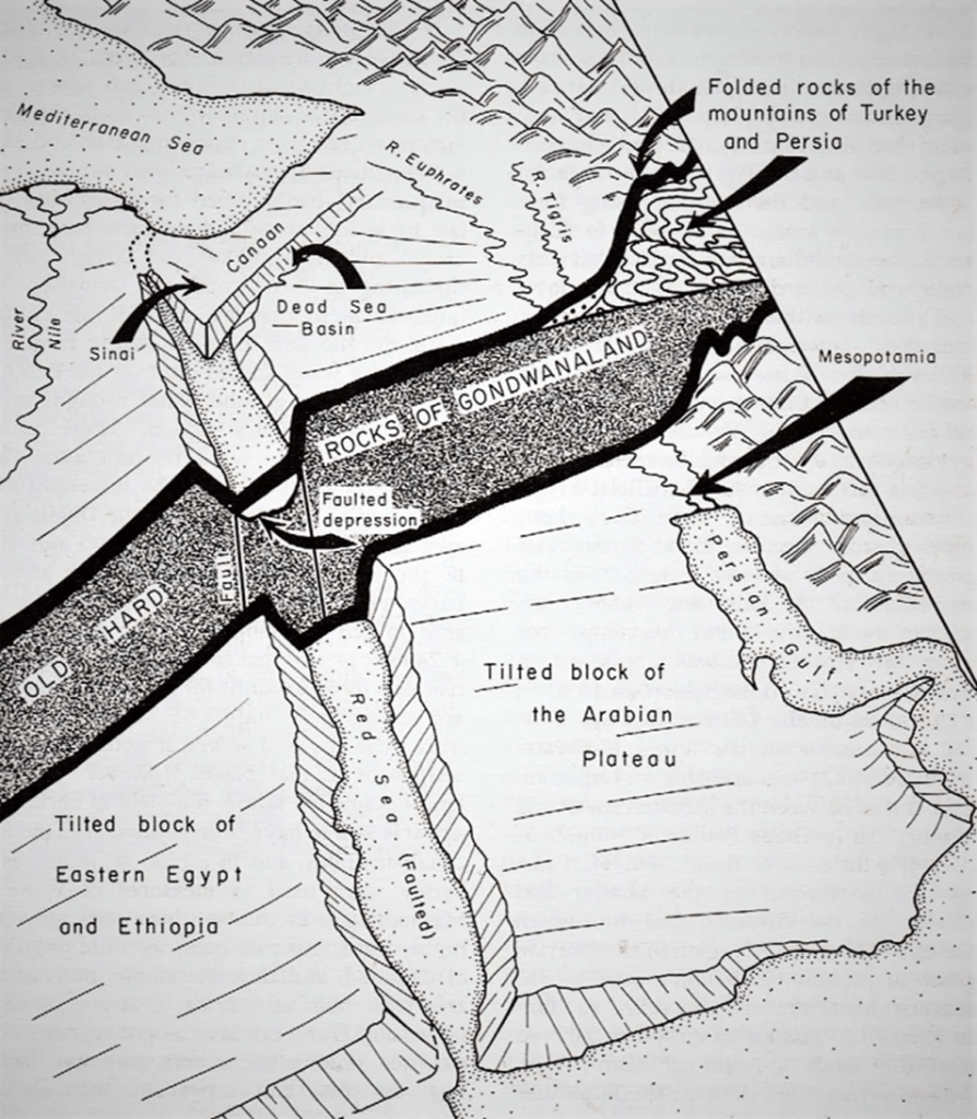 At the heart of the whole area sometimes called the ‘Near’ East, sometimes the ‘Middle East’ lies the plateau of Arabia. This was once part of a large block called ‘Gondwanaland’ by geologists. To the north and west of this lay the sea which they call ‘Tethys’ of which the present Mediterranean is a remnant. The coastline of this sea fluctuated, sometimes extending far into what is now the land east and south-east of the Dead Sea, and leaving behind on top of the sandstone layers a layer of limestone, which formed the hills around Jerusalem. Another layer of softer limestone was formed, which was worn away to leave some of the mountain passes of modern Israel. On top of this came a third, harder layer of limestone, now seen between Mount Carmel and Samaria, and in the mountains east of the Jordan. Further geological shifts led to Mesopotamia and Canaan being brought together as one geologically-related area. However, in the Tertiary period, the seabed of Tethys, based on less resistant rock than Gondwanaland, was forced up by pressure acting from the north and was pushed and folded into mountain chains against the unyielding edge of Gondwanaland. At the same time, the plateau shattered in several places, dividing roughly to create the ‘boundaries’ of Africa and Arabia, and producing the shape of ‘Canaan’. The Meditteranean coast of this area became famous as a bridge between Asia and Africa, and clearly helped the rise of its civilisations. As a result, ‘Mesopotamia’, the land between the two rivers of the Tigris and Euphrates, is composed of two geographical regions; the northern region is the ‘island’ between the two great rivers, and the Delta region of the south, comprising ancient Sumer and Akkad, Babylon, biblical Shinar with Elam away to the east.
